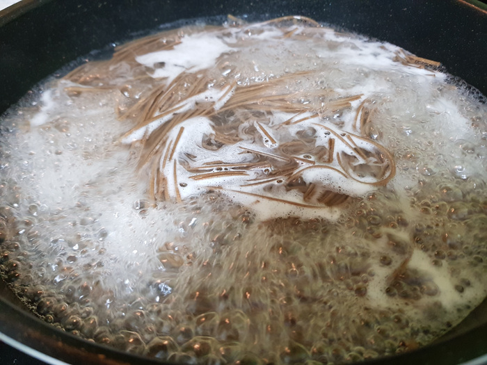 그리고 메밀만 삶으면 되는데요. 물이 팔팔 끓어오르면 찬물을 넣고 한 번 더 삶으면 쫄깃하게 메밀이 잘 삶아집니다.