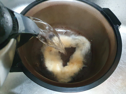 밥솥에 각종 채소를 넣어 삶다가 시꺼멓게 탔다면 저처럼 과탄산소다와 뜨거운 물을 이용해 설거지해 보세요.