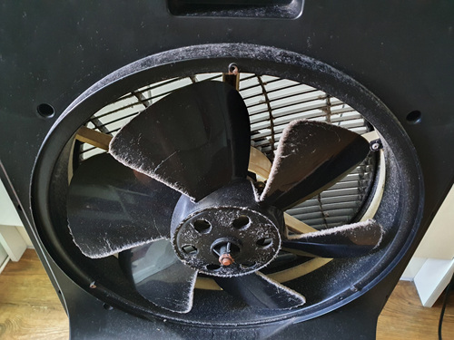 선풍이 앞부분을 떼어 내니 안쪽에 먼지가 가득합니다.