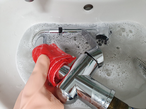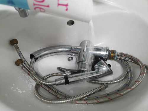 과탄산소다를 수전에 약 1스푼 정도 솔솔 뿌린 뒤 뜨거운 물을 부어 불려 줍니다.
