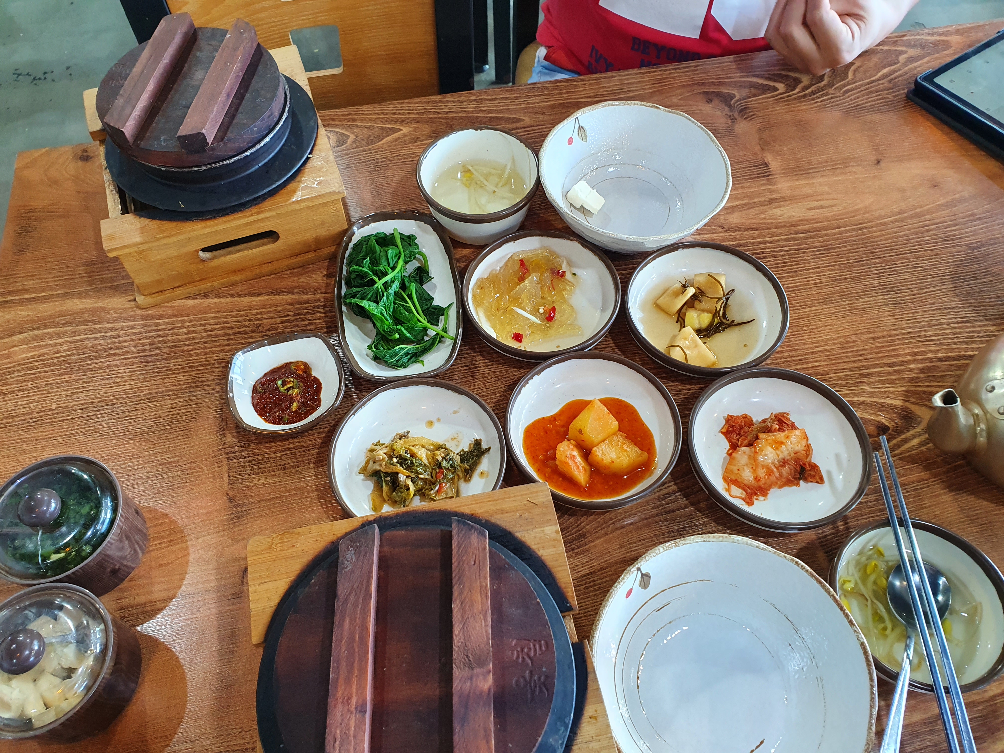 전복돌솥밥 2개를 주문하고 기다리니 반찬이 테이블에 놓여졌어요.