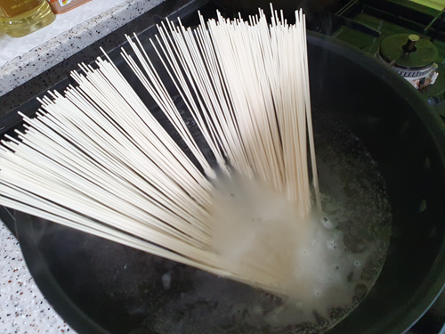 전 한 번 더 넣어 2인 분용으로 국수를 삶았어요.