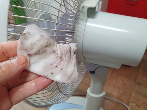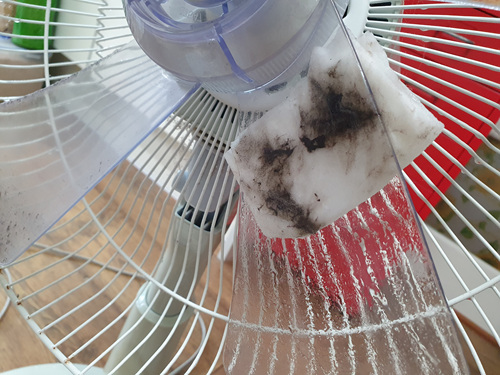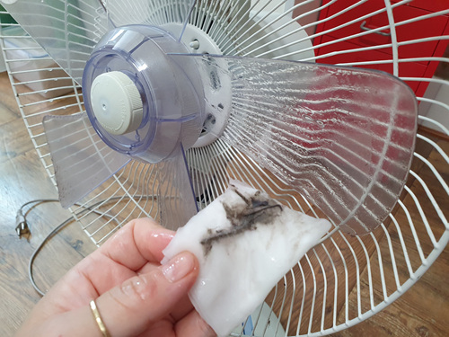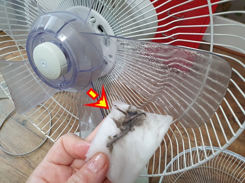 선풍기망 먼지만 임시방편으로 닦아야지 하며 닦다 너무 깨끗이 닦이길래 엉겹결에 선풍기 날개까지 닦았더니 더 대박이었죠.