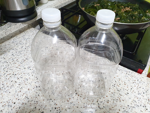 미역 한 솥을 끓여 놨으니 이제 페트병을 준비하면 된다. 이것으로 미역국을 소분으로 담아 놓기 위함이다. 물을 많이 마시다 보니 빈 페트병도 은근히 쌓여 난 이렇게 1회용 통으로 재활용한다.