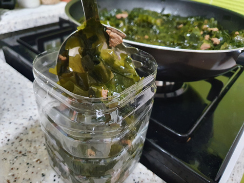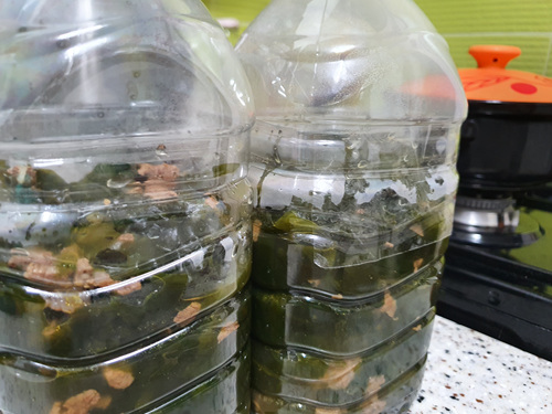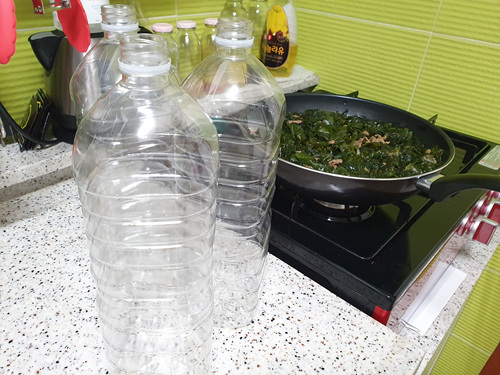 미역 한 솥을 끓여 놨으니 이제 페트병을 준비하면 된다. 이것으로 미역국을 소분으로 담아 놓기 위함이다. 물을 많이 마시다 보니 빈 페트병도 은근히 쌓여 난 이렇게 1회용 통으로 재활용한다.