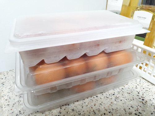 달걀 한 판(30개)에 플라스틱 통 2~3개면 깔끔하면서도 안전하게 냉장고에 보관이 가능합니다.
