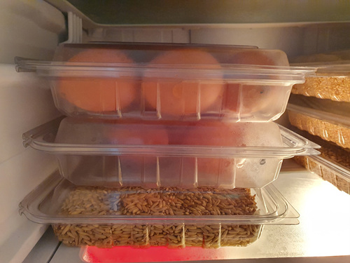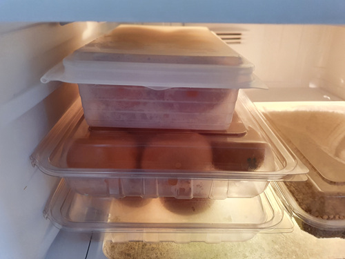 각종 채소를 삶은 뒤 남은 채소는 얼리는데 이때 평평하게 할 때도 플라스틱 통을 사용해요.