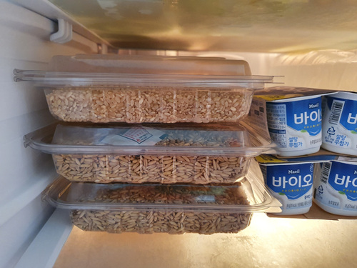 이렇게 보관하면 어떤 쌀 종류인지 한눈에 찾기 쉽고 차곡차곡 쌓아서 냉장실에 깔끔하게 보관하기도 좋아요.
