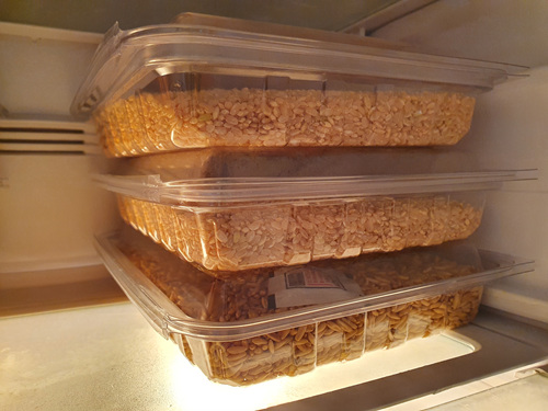 이렇게 보관하면 어떤 쌀 종류인지 한눈에 찾기 쉽고 차곡차곡 쌓아서 냉장실에 깔끔하게 보관하기도 좋아요.