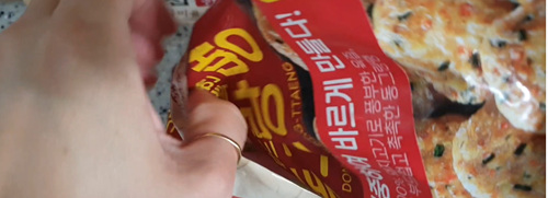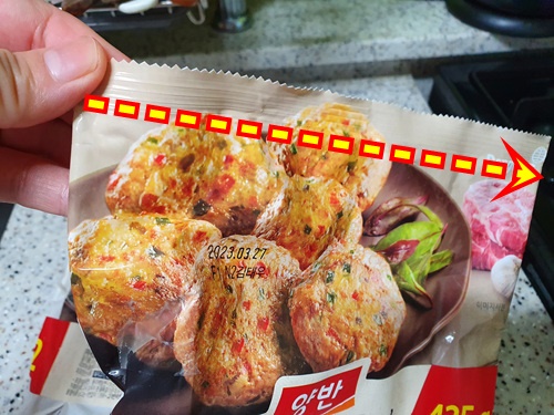 가위로 냉동식품 포장지의 윗부분을 자른 뒤 두 봉지 냉동식품을 한 봉지로 만들기로 했답니다.