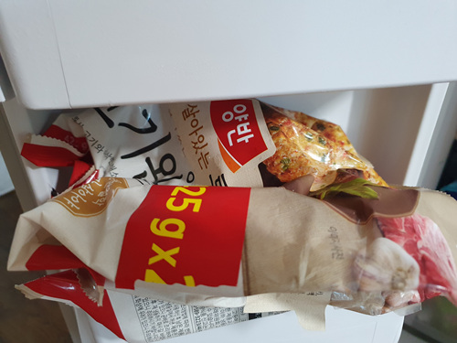냉동식품 치킨류는 그냥 한 봉지 그대로 세워서 보관하고요.