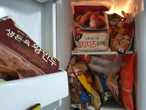 냉동실 문칸에도 냉동식품이 가득 차 있네요.
