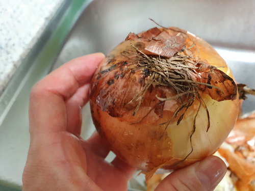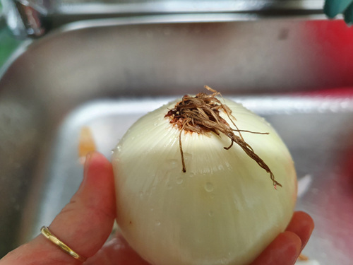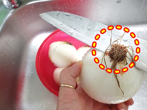 이제는 그러지 마시고 뿌리 부분은 손대지 말고 그 반대편을 칼로 자른 뒤 양파껍질을 벗겨 보세요.