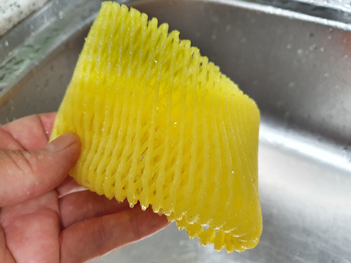 과일 포장망 주방세제를 묻히면 거품이 장난이 아니게 일어나요.