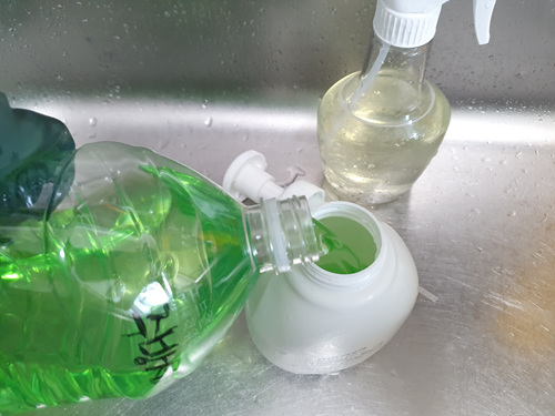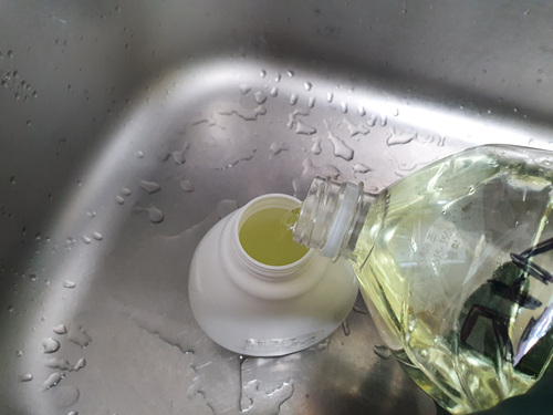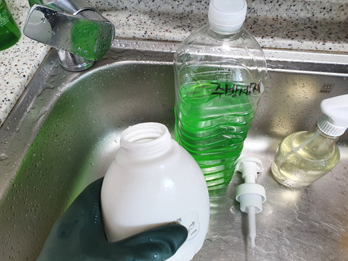 가게에 대용량 주방세제를 사용하기에 집에 사용하려고 페트병에 담아 왔지요.