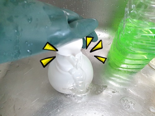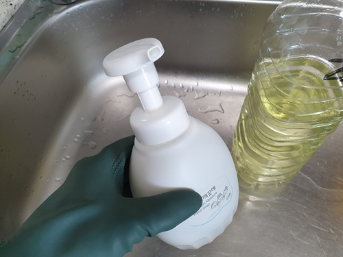 하여간 주방세제를 손세정제에 넣었더니 물 같은 락스와 달리 진득한 느낌의 주방세제는 펌프를 하면 거품처럼 나왔어요.