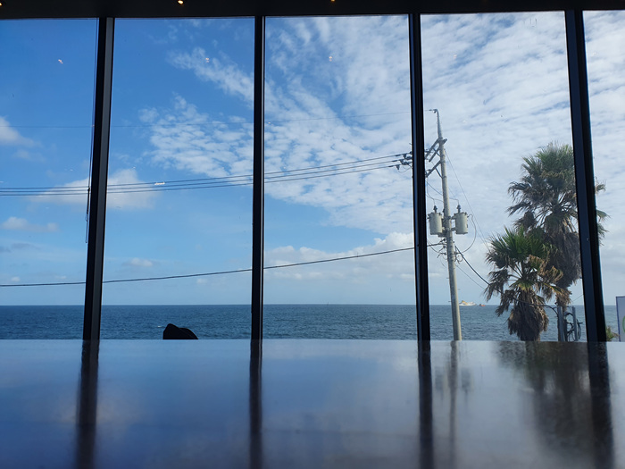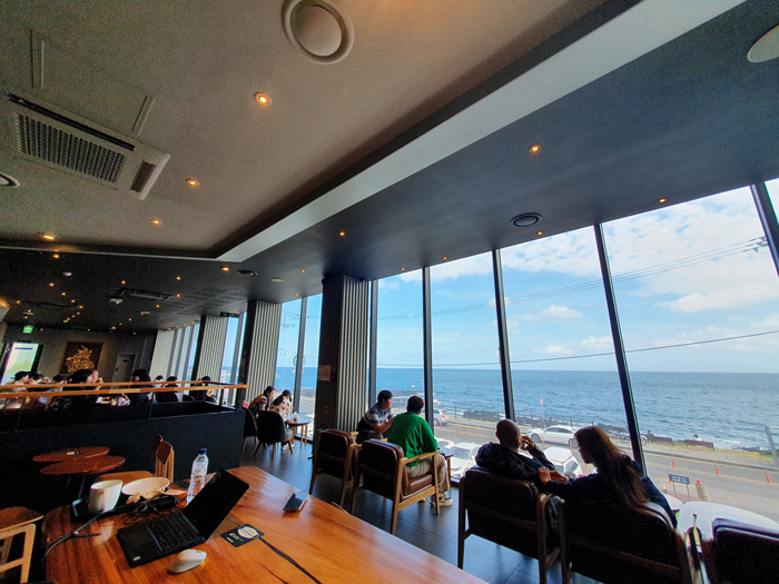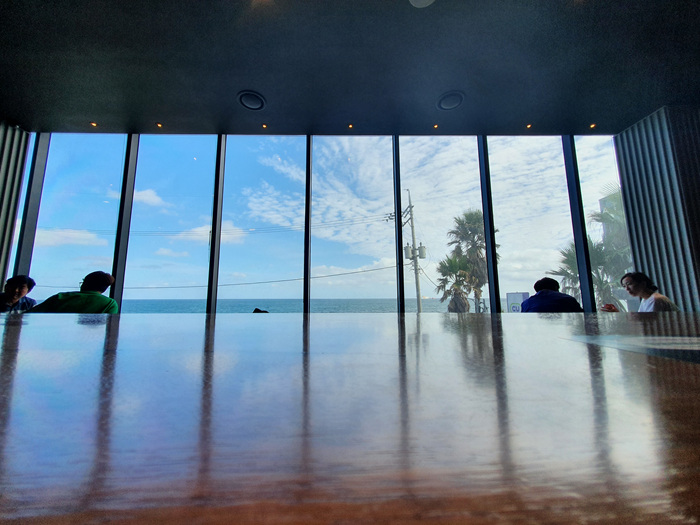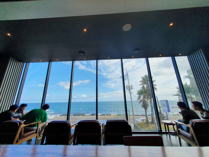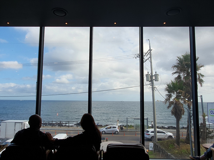 그래도 카페 안은 통창으로 인해 밖의 아름다운 바다 풍경은 볼 수 있었답니다. 맨 앞 줄에 앉은 분들은 정말 멍 때리기 좋을 듯해요. 뭐 그게 바로 제주여행의 휠링이겠죠.