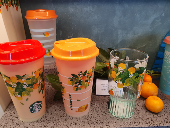 감귤이 그려진 텀블러와 컵