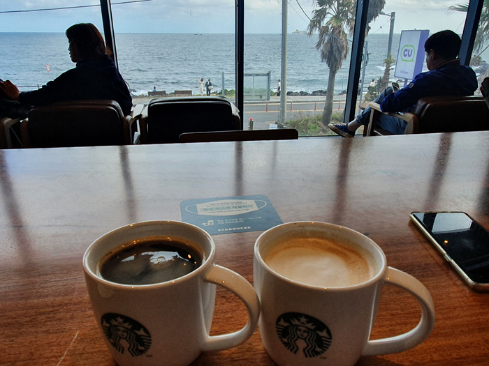 며칠 전 일을 마치고 잠깐 커피 한잔을 하러 스타벅스에 들렀어요. 제주도 유명 카페들은 대부분 풍경이 좋은 곳에 위치해 있어 커피 한 잔 마시며 멍 때리며 휠링 하기 그만이죠.