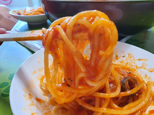 스파게티는 포크로 먹어야 더 폼 나긴 하지만 우린 그냥 나무젓가락으로 먹었지요.