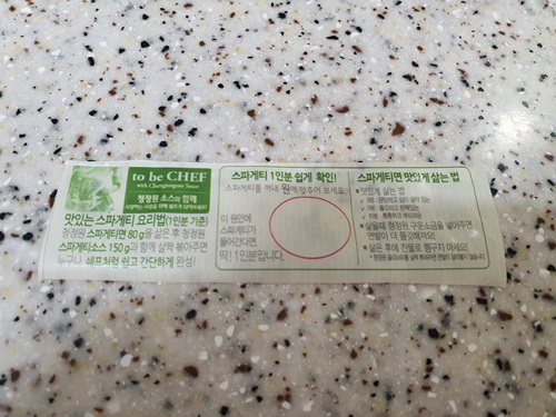 혹시나 다음에 스파게티 양을 측정할 일이 있을까 봐 비닐봉지 겉면의 안내 문구를 잘라 놓았답니다.