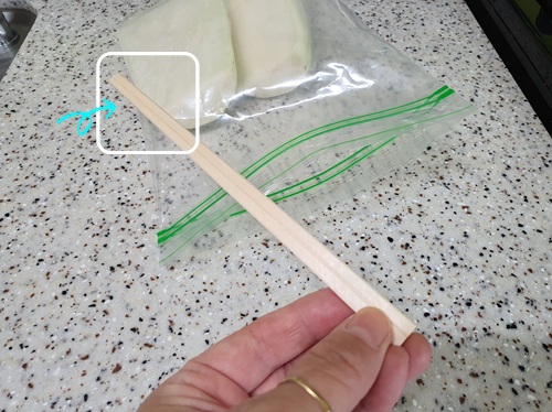 잘 닫히지 않는 지퍼백을 한 방에 닫아 줄 것은 바로 나무젓가락입니다.