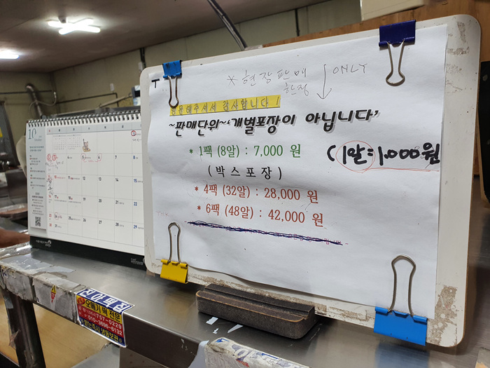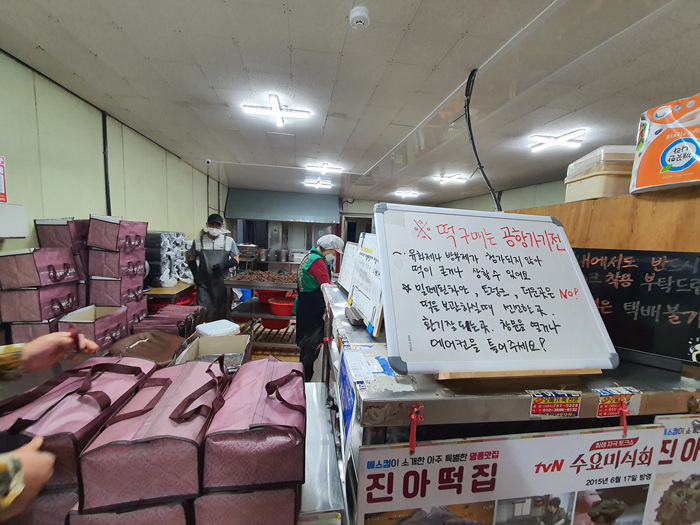 새벽에 사러 많이 오는 걸까? 떡을 만들고 포장하는 모습이 바빠 보였다. 역시나 갓 만든 말랑말랑한 오메기떡을 사러 오는 분들이 늘어서일까.. 안내문구까지 있었다.