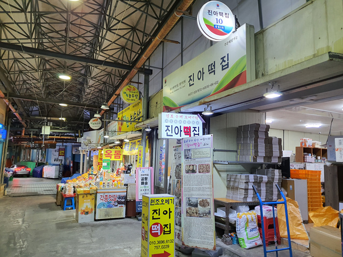 동문시장 내 가게들은 거의 문을 닫은 상태인데 떡집과 과일가게가 환하게 불을 밝혀져 있었다. 우리가 간 가게는 바로 진아 떡집이다. 사실 동문시장을 자주 다녀 보긴 했지만 인터넷 검색으로 진아 떡집을 찾아왔는데 은근 등잔 밑이 어두웠던 게 아닌가 하는 생각까지 들었다. 바로 동문시장 주차장 바로 밑에 있었기 때문이다.