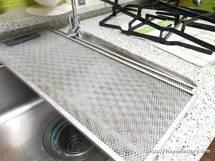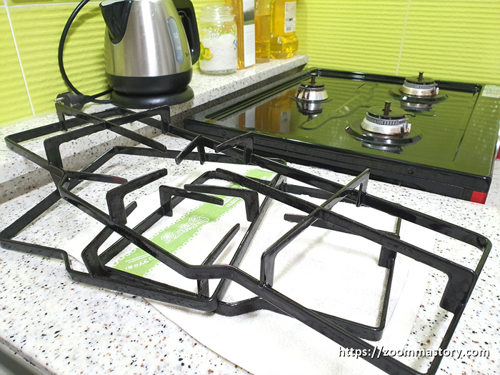 깨끗이 씻은 후드필터와 삼발이는 물기를 제거하고 조립해야 깔끔하다.