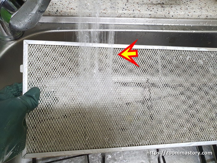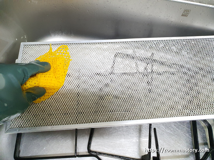 주방세제를 묻혀 후드필터를 닦은 후에는 꼭 온수로 헹궈야 확실하게 기름기를 제거할수 있다.