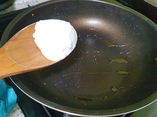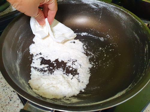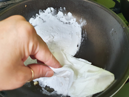 후라이팬에 생선 구운 뒤에는 베이킹소다를 뿌려 기름 흡착을 먼저 해 주세요. 그리고 티슈를 이용해 뭉쳐진 기름을 닦아 줍니다.