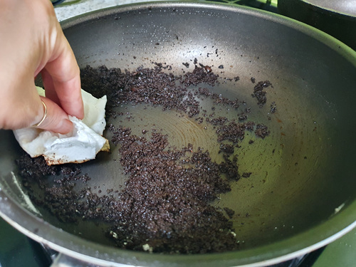 기름이 흡착된 베이킹소다를 제거 후에는 드립커피에서 사용한 원두찌꺼기를 후라이팬에 골고루 뿌려 줍니다.
