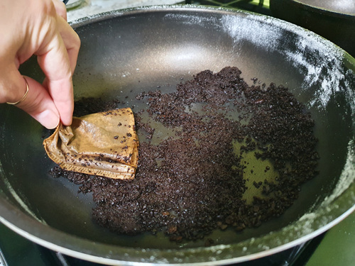 기름이 흡착된 베이킹소다를 제거 후에는 드립커피에서 사용한 원두찌꺼기를 후라이팬에 골고루 뿌려 줍니다.