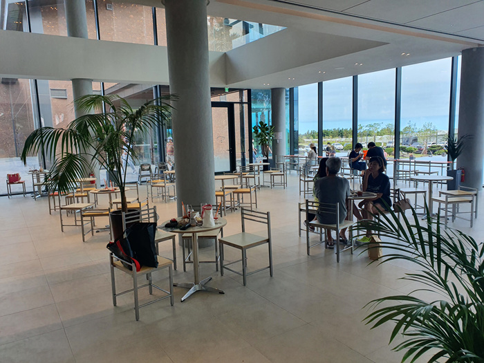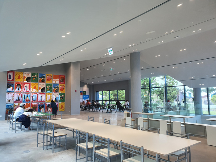 넓은 실내에 테이블이 여유롭게 비치되어 있습니다. 통유리라 밖을 시원하게 볼수 있어 더 크게 느껴지는 카페 내부 분위기였습니다.