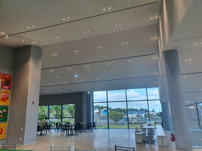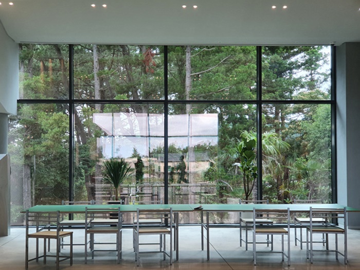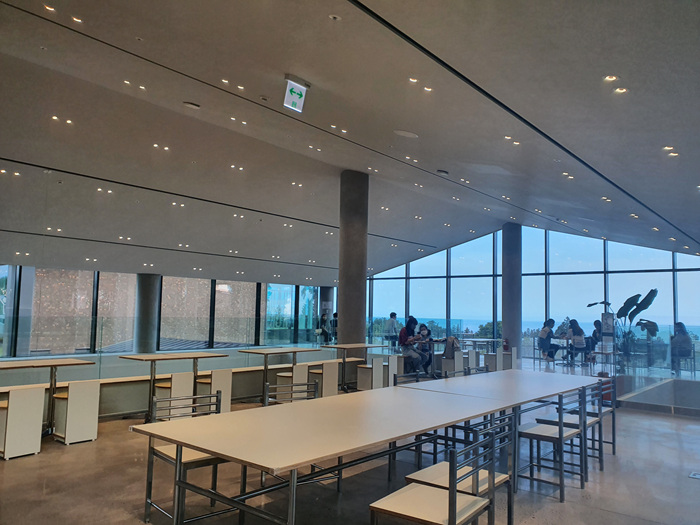 넓은 실내에 테이블이 여유롭게 비치되어 있습니다. 통유리라 밖을 시원하게 볼수 있어 더 크게 느껴지는 카페 내부 분위기였습니다.