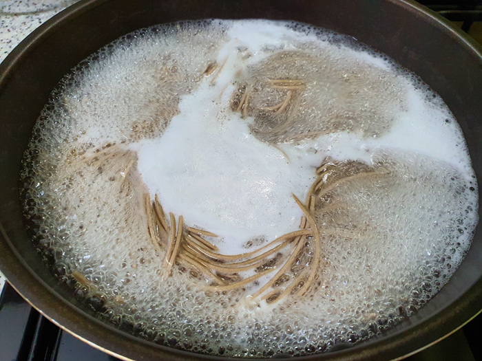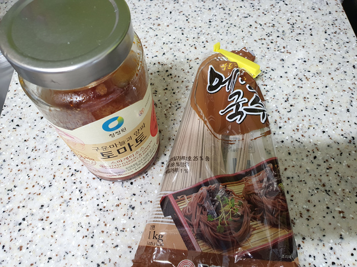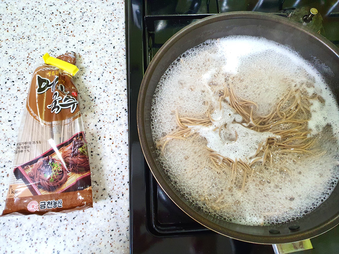 일단, 청소 하느라 배가 고프니까 메밀국수를 삶았다.