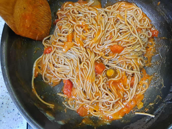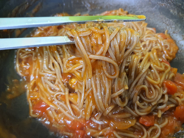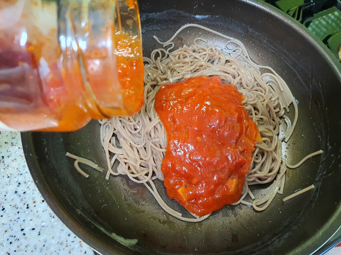 메밀국수 면을 삶고 스파게티 소스를 넣고 조리하기 시작했다.