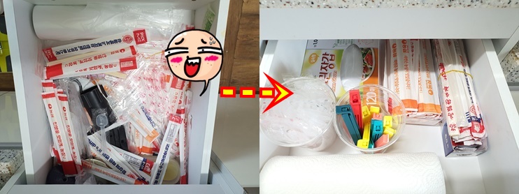 온통 서랍 속을 가득 채웠던 1회용 스푼등 각종 물건들이 재자리를 찾은 듯 깔끔하게 변해 있다.