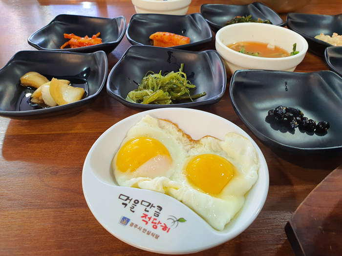 경주 시내에서 유명하다는 한 음식점에 갔다. 이곳은 점심시간이 되면 북새통을 이룰 정도로 붐비는 곳이라고 해 우린 오픈과 동시에 가게 되었다. 일찍 가면 웨이팅이 길지 않을 것 같아서 말이다. 그런데 딱 12시 점심시간만 바쁜건지 영업시간에 딱 맞춰서 갔던 시간엔 손님이 한 명도 없어 적잖게 당황했다.