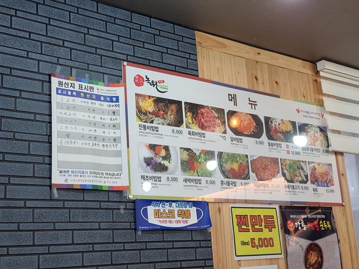 메뉴 옆에는 원산지 표기도 잘 되어 있었다. 대부분 국내산이라 믿고 먹을 수 있다는 생각이 들었다. 순두부에 들어가는 콩만이 미국산, 호주산으로 표시되어 있었다. 메뉴를 보니 정말 다양했다. 전통비빔밥, 육회비빔밥, 알비빔밥등 대부분 비빔밥 위주의 메뉴였다.