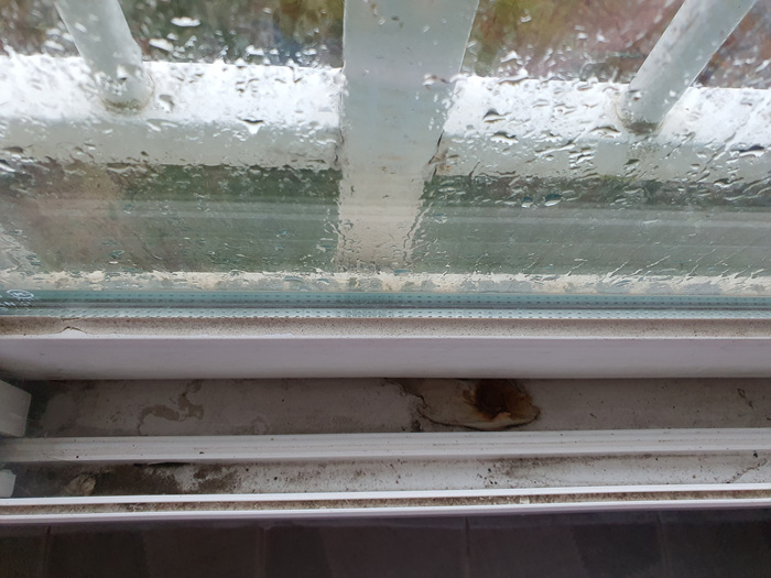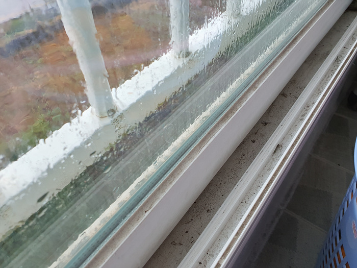 비가 그친 후 얼룩이 덕지덕지 묻어 있는 베란다 창틀의 모습이다. 물기가 조금 있기 때문에 버리는 양말을 이용하면 정말 깔끔하게 청소가 가능하다.