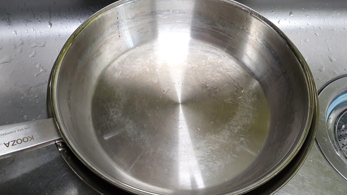 깨끗이 씻고 나니 어떤가요. 얼룩이 싹 없어졌죠. 스테인레스 후라이팬을 씻을때 철수세미로 닦는 분들이 간혹 계시던데 절대 그렇게 하지 마시고 부드러운 수세미로 닦아 줘야 합니다. 물론 얼룩이 많다면 구연산물 사용하시고요.