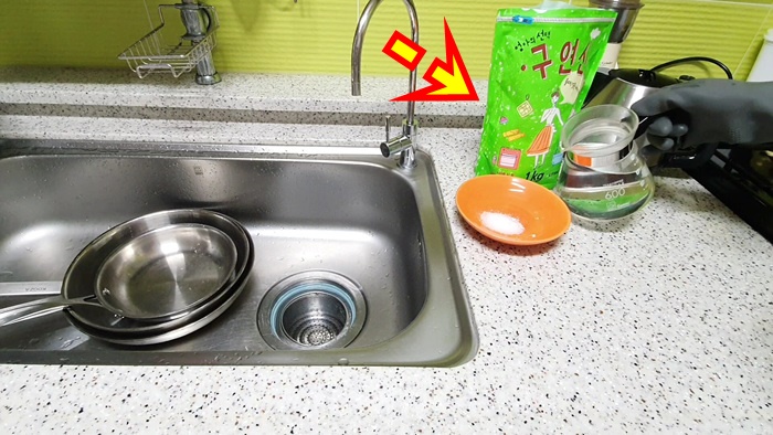 스테인레스 후라이팬 닦기 전에 준비할 것은 구연산과 뜨거운 물입니다. 구연산에 뜨거운 물을 부어 잘 녹여 줍니다. 이때 구연산과 물의 비율은 구연산이 10g이면 물은 1L 희석해 사용하면 되는데요. 닦을 후라이팬이 적다면 양을 조절해 사용하시면 됩니다.