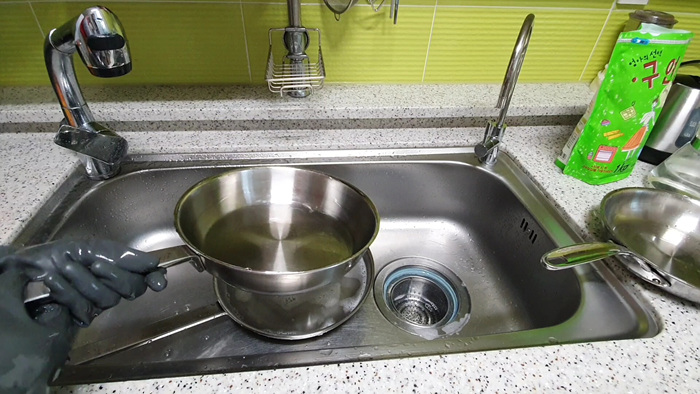 사용한 구연산물은 그냥 버리지 말고 다른 후라이팬에 옮겨 같은 방법으로 해 주시면 되세요.