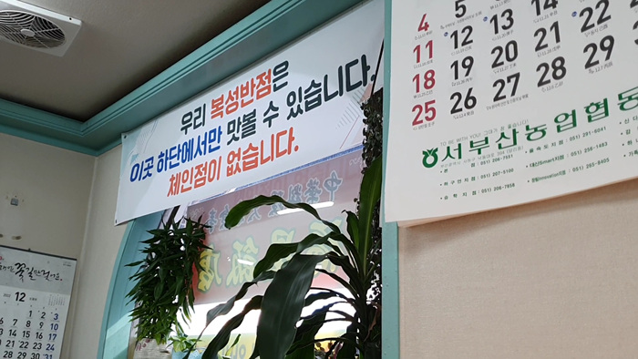 식당에서 앉아서 식사를 하시는 분들도 많지만 이곳은 대부분 배달이 많은 것 같더라고요. 워낙 부산에서 유명한 짬뽕집이다 보니 다른 곳에서도 비슷한 것을 파나 봅니다. 가게 안 현수막이 눈에 띄었습니다. 체인점이 없다고 하니 참고하시면 될 것 같네요.