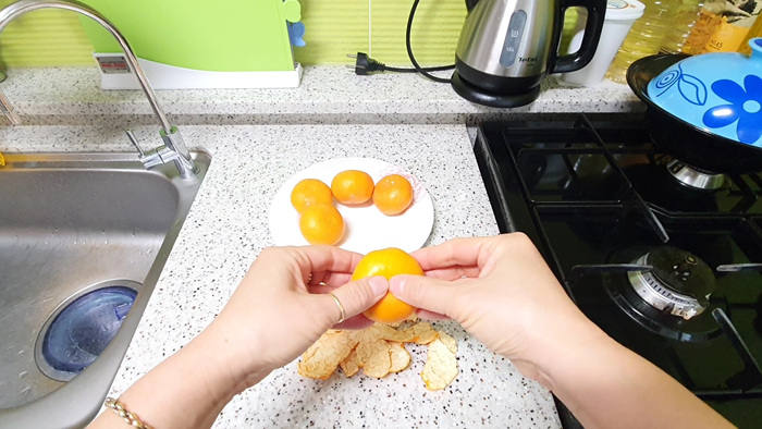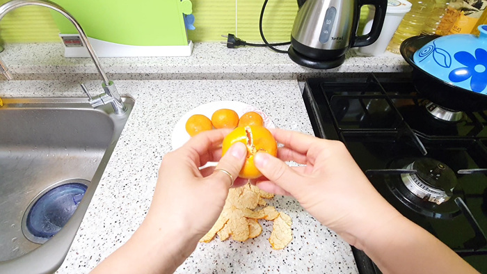 밀감 움푹 패인 부분을 약간 누르면 '쏙' 하고 들어가는데요. 그 부분을 살살 밀면 세로로 밀감껍질에 금이 갑니다.