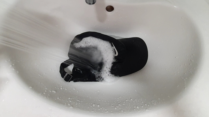 칫솔로 가볍게 세탁한 모자는 깨끗이 헹군 뒤 물기를 꽉 짜 준다.