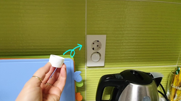 잘 씻어 말려 놓은 치약 뚜껑을 콘센트에 꽂아 보겠습니다.