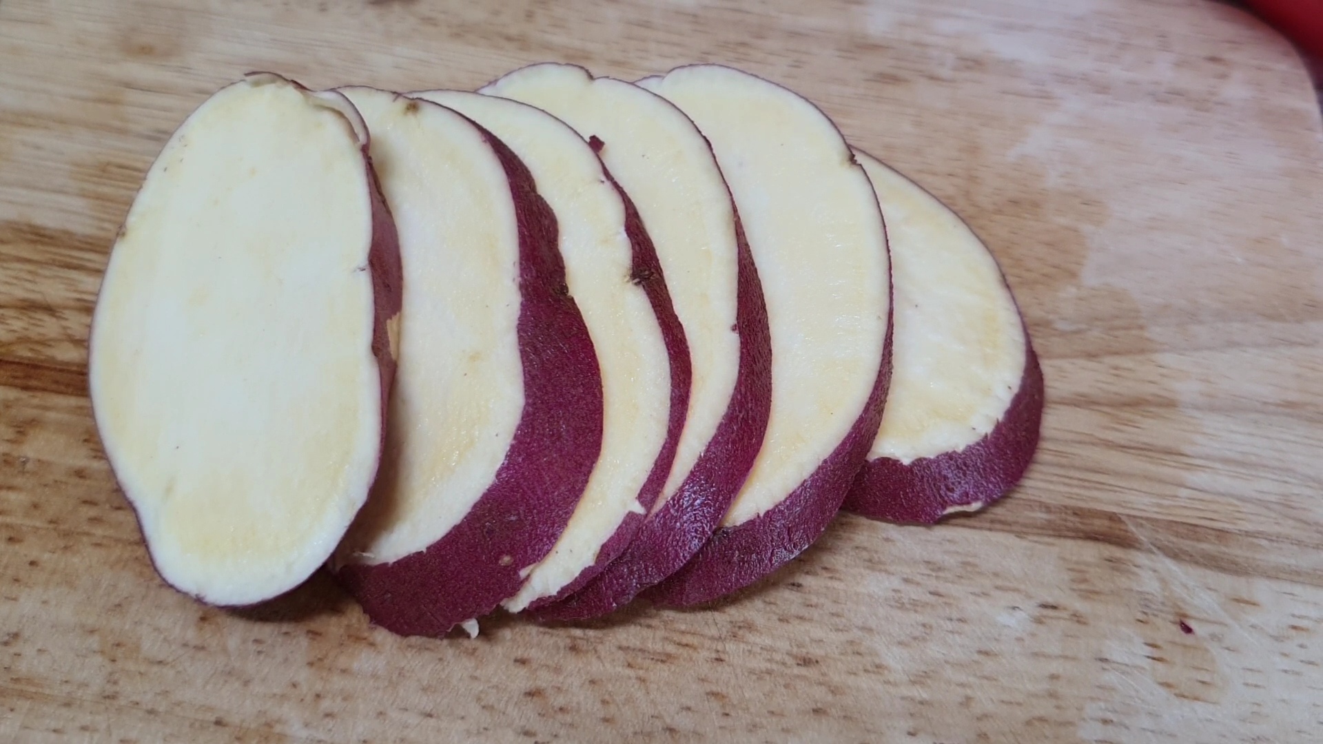 고구마를 깨끗이 씻어 먹기 좋게 썰었어요.