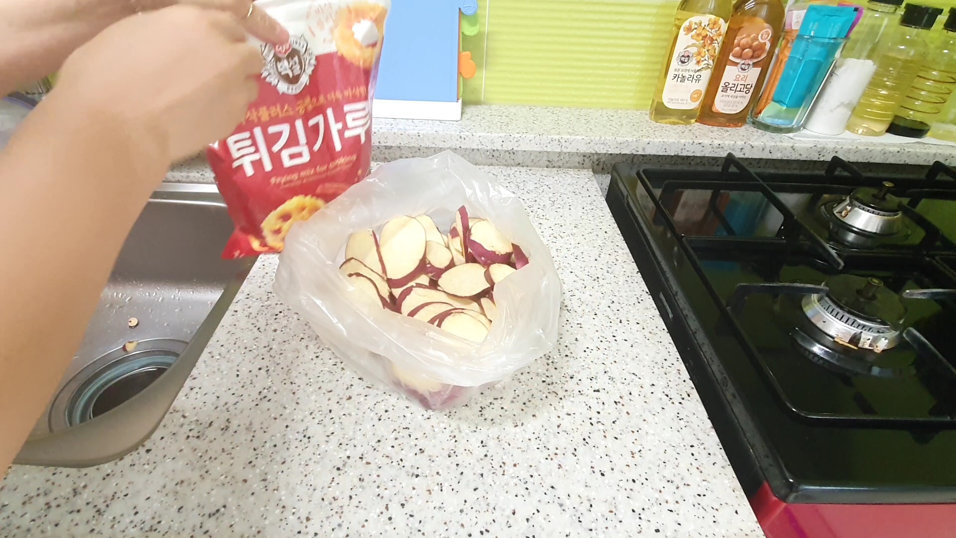 그리고 튀김가루를 묻혀 두었어요. 튀김가루 묻힐 때는 1회용 비닐봉지를 이용하면 주방이 엉망 안되고 요리가 편해요.